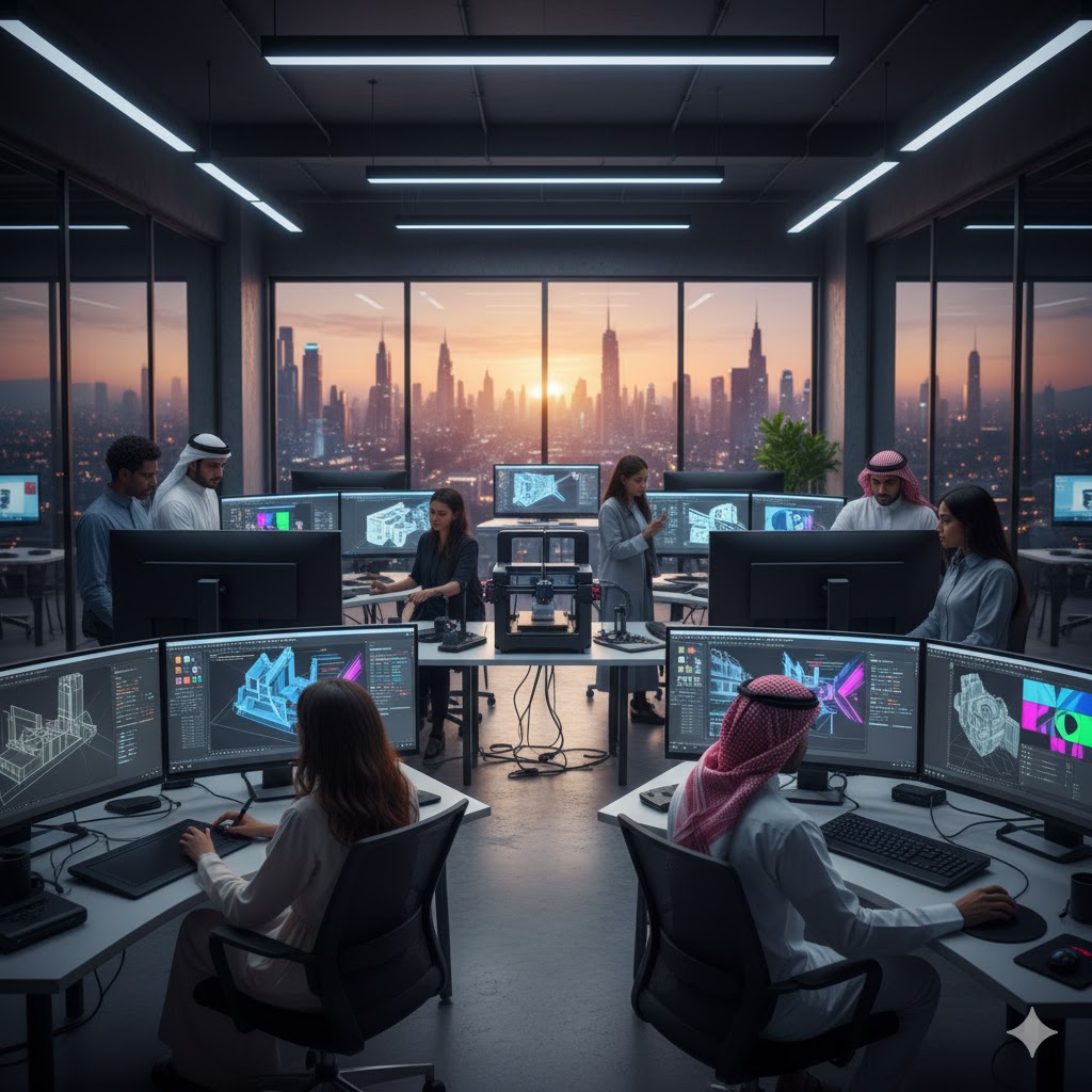 نوفر بيئة متطورة بأجهزة حاسوبية وبرمجيات متخصصة (مثل AutoCAD و Adobe Creative Suite) لإنتاج تصاميم ثلاثية الأبعاد ونماذج مادية.